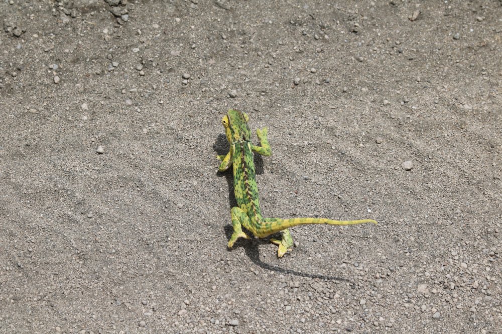 kameleonten en utmärkt förmåga att röra sig i vegetationen. Stjärten smalnar av mot spetsen och kan