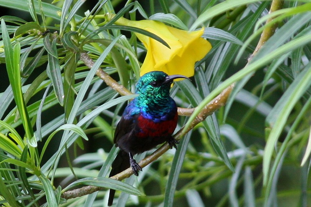 är MALAWISOLFÅGEL. Hanen har ett rött och ett blågrönt fält tvärs över bröstet, huvudet är grönt och